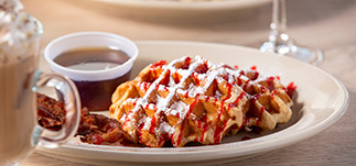 Two Belgian Waffles topped with Whipped Cream, Raspberry Drizzle, and Powdered Sugar, served with Smoked Bacon and Maple Syrup